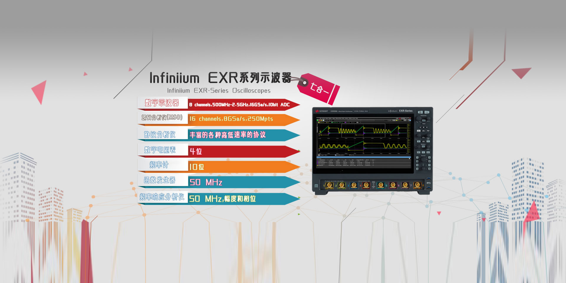 示波器 電源 萬用表 信號源 數據采集儀及模塊 頻譜分析儀 網絡分析儀 音頻分析儀 波形發生器 LCR表 便攜式射頻分析儀 電流波形分析儀 功率計 頻率計數器 探頭 USB產品